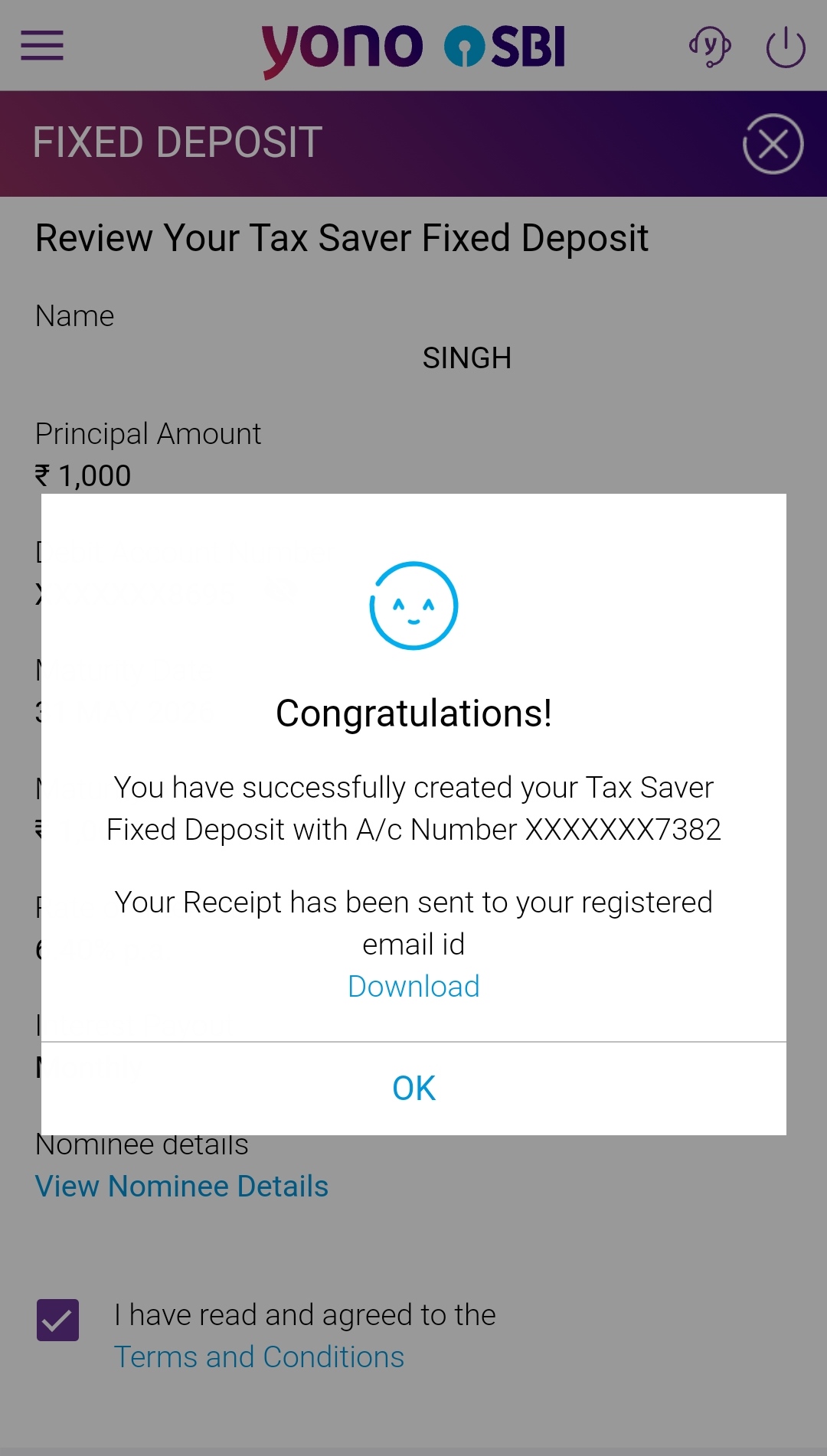 Your FD details will be given on the next page along with the congratulatory pop up which says you have successfully created your tax saver fixed deposit with the FD account number.