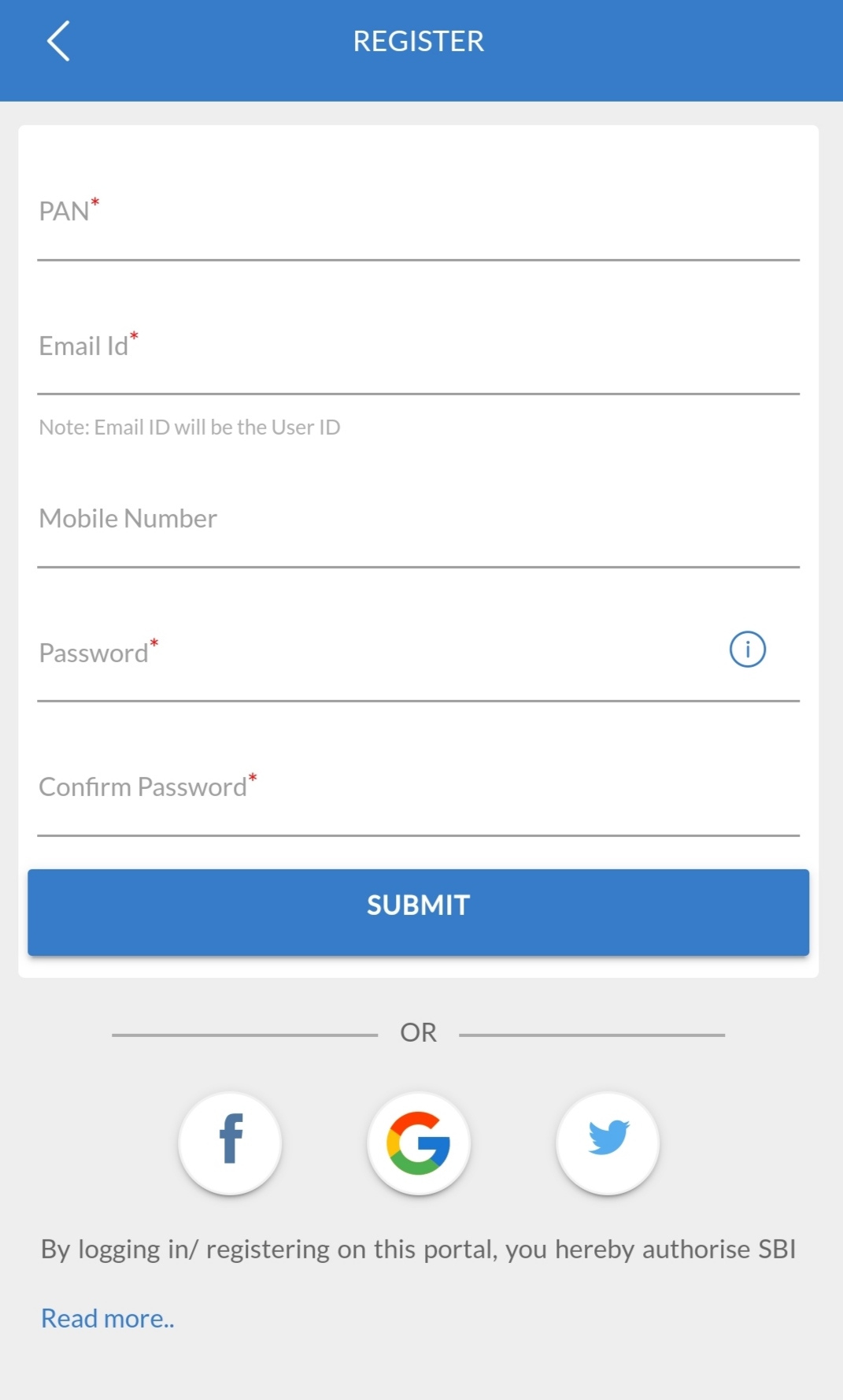 Open the app and click on to new user button. Fill up the required data such as PAN number, email address, mobile number, and password and confirm the password.